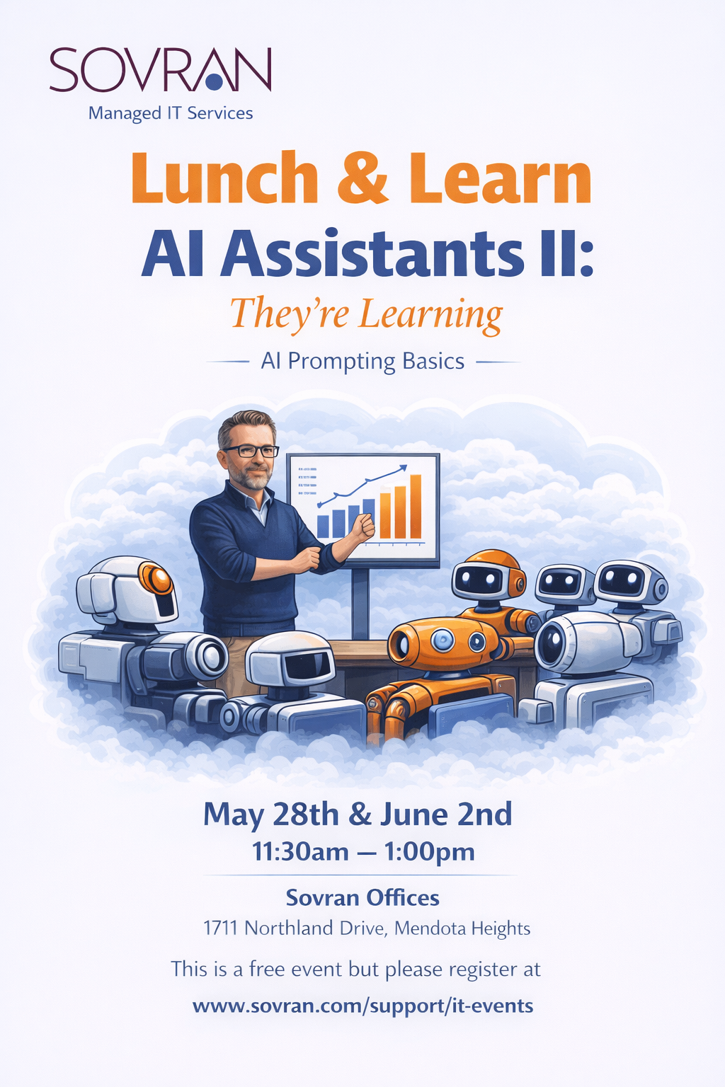 Join the Sovran team for a lunch and learn! Our cybersecurity experts will teach you about AI assistants from a variety of providers, such as OpenAI’s ChatGPT, Microsoft’s Copilot, X’s Grok, and Google’s Gemini. The discussion will revolve around learning basic prompts you can use to kickstart your brain and your AI assistant.
