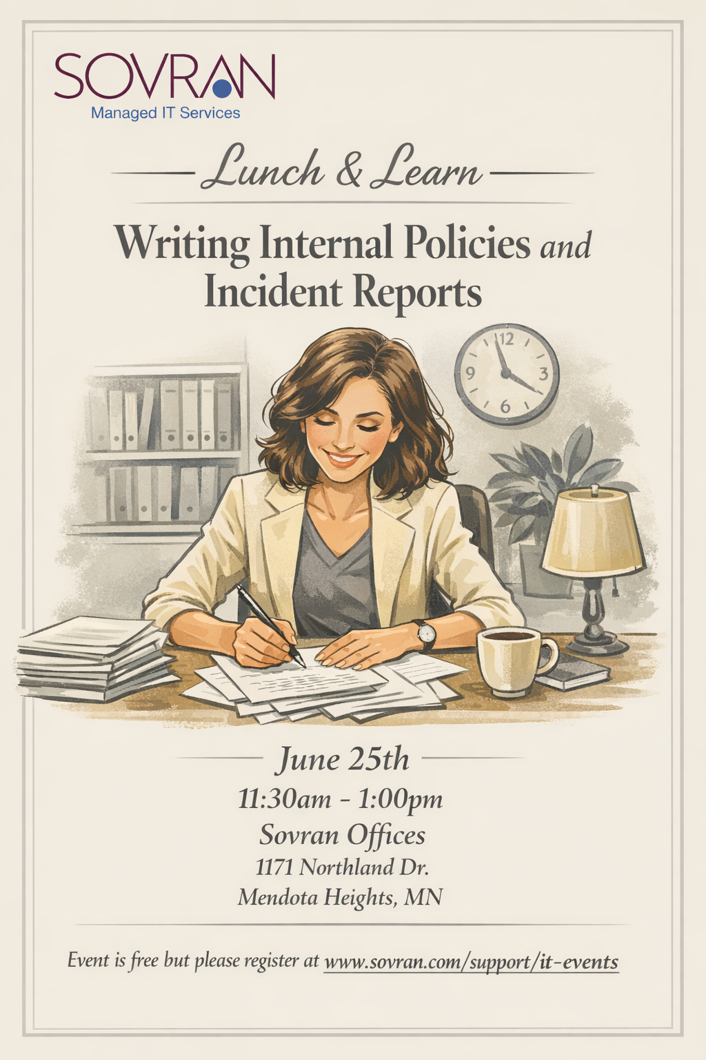 Join the Sovran team for a lunch and learn! Our IT management experts will guide you through the process of writing internal policies to guide your IT decisions and usage, as well as templates for incident reports to ensure proper follow-through!